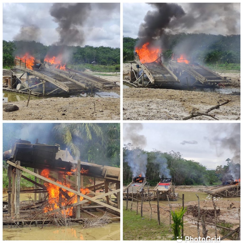 “Selanjutnya langkah yang diambil adalah melakukan pengrusakan terhadap rakit PETI dengan cara di robohkan dan dibakar sebanyak 24 unit mesin dompeng dengan tujuan agar tidak bisa digunakan lagi oleh para pelaku PETI tersebut, ” ujar Kompol Hendri.