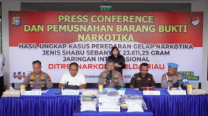 Mediasynergi86.id- Pekanbaru – Direktorat Reserse Narkoba Polda Riau menangkap tujuh orang tersangka jaringan narkoba internasional. Dari para tersangka, diamankan total 23,6 kilogram narkotika jenis sabu.