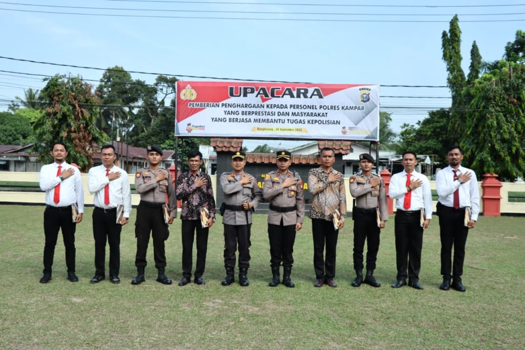 Sebanyak 6 personel diberikan penghargaan oleh Kapolres Kampar, karena berprestasi dan berdedikasi tinggi dalam pelaksanaan tugasnya dan 2 Masyarakat yang berjasa membantu tugas kepolisian.