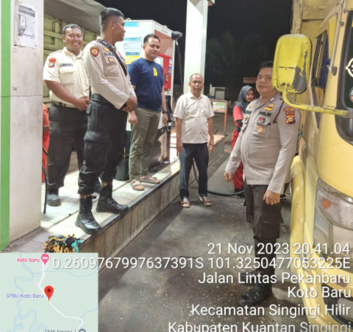 TELUKKUANTAN,Mediasynergi86.id- Personil Polsek Singingi melakukan pengecekan pendistribusian BBM Bersubsidi di SPBU Koto Baru Kecamatan Singingi Hilir, Kabupaten Kuansing, Selasa (21/11/2023) Pukul 20.30 WIB.