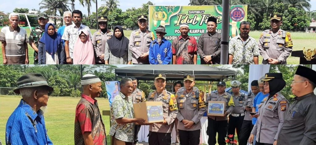 Dalan rangka menyambut ilIdul Fitri 1445 H tahun 2024 Polres Kampar bagi-bagi sembako di alun-alun Desa Tanjung Sawit, Kecamatan Tapung Kabupaten Kampar, Jum’at (5/4/2024) sekira pukul 13.30 Wib.