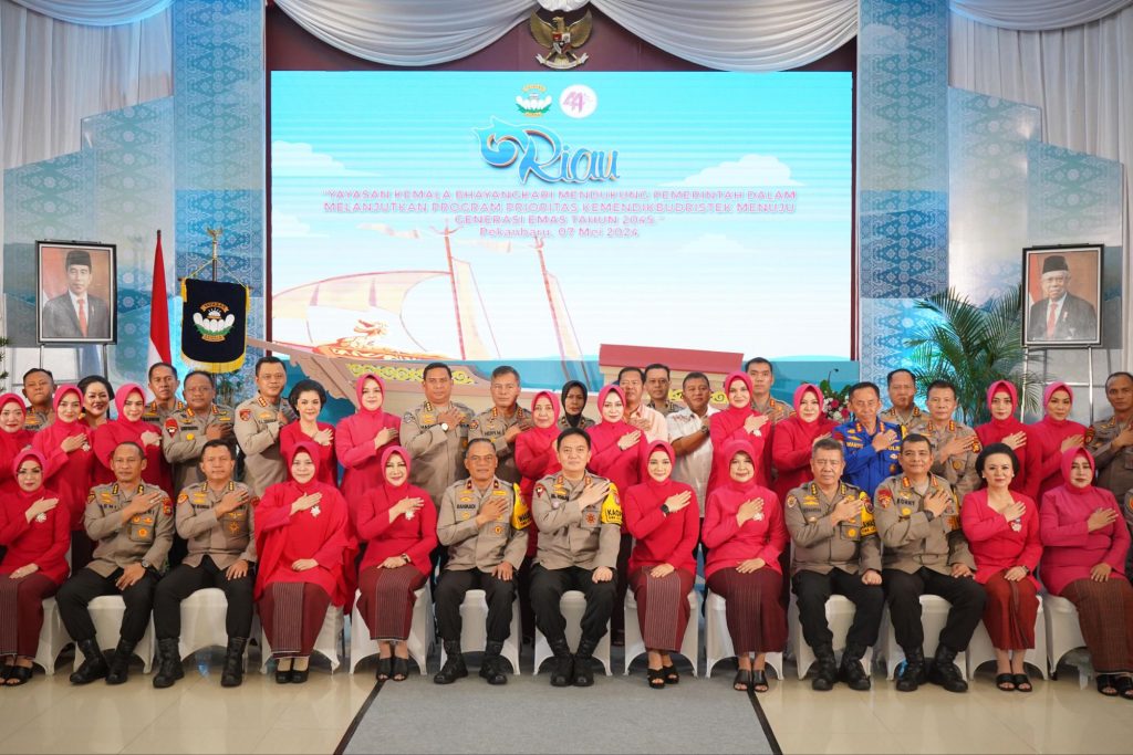 Kapolda Riau Irjen M Iqbal dan Ketua Bhayangkari, Nindya Iqbal menghadiri acara syukuran Hari Ulang Tahun (HUT) Yayasan Kemala Bhayangkari (YKB) ke-44 di Aula Tribrata Mapolda Riau, Selasa (7/5/2024). HUT ke-44 ini mengusung tema “Yayasan Kemala Bhayangkari Mendukung Pemerintah Dalam Melanjutkan Program Prioritas Kemendikbudristek Menuju Generasi Emas Tahun 2045”.