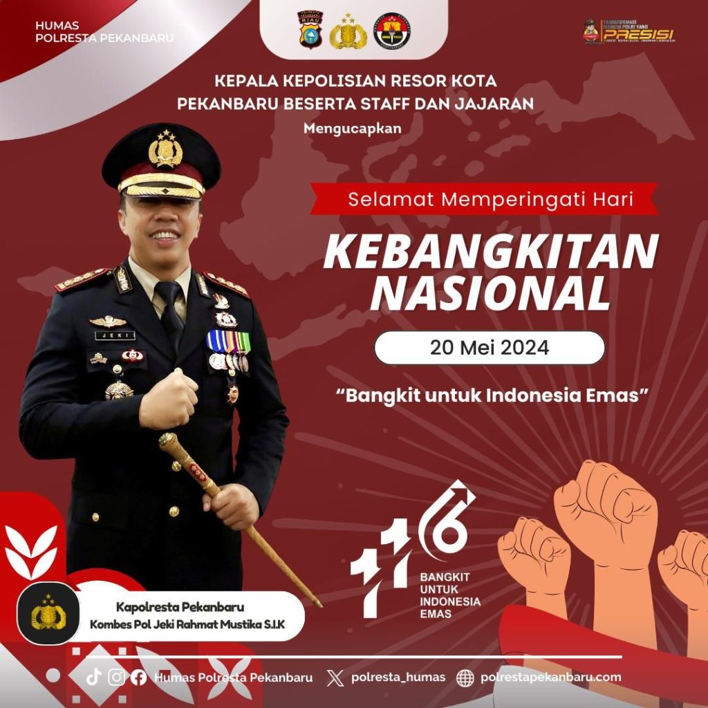 Polresta Pekanbaru gelar upacara peringatan Hari Kebangkitan Nasional ke-116 yang dilaksanakan dilapangan apel Mako Polresta Pekanbaru Jalan A. Yani kota Pekanbaru, Senin (20/05/2024).
