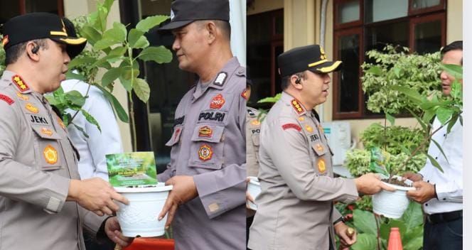 Mediassynergi86.id,Pekanbaru – Dalam upaya mendukung program penghijauan dan menjaga kelestarian lingkungan, Kapolresta Pekanbaru Kombes Pol Jeki Rahmat Mustika, S.I.K memberikan hadiah istimewa berupa bibit pohon buah kepada sejumlah personel Polresta Pekanbaru yang berulang tahun. Kegiatan ini dilaksanakan secara simbolis usai pelaksanaan apel pagi di Lapangan Apel Polresta Pekanbaru, Senin (07/04/2025) pukul 08.30 WIB.