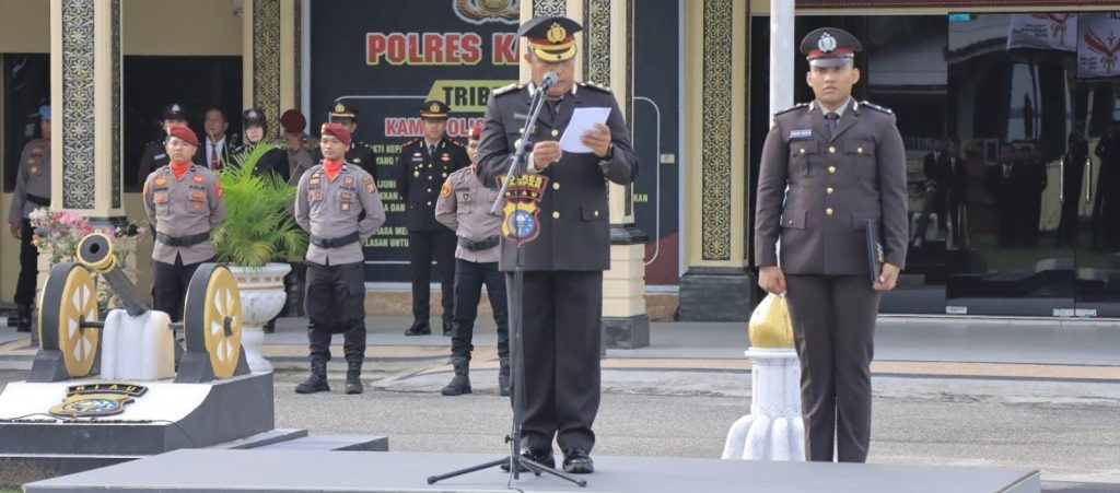 Bertindak selaku Inspektur Upacara Kapolres Kampar AKBP Mihardi M yang diwakili oleh Kabag Ops Kompol Romi Irwansyah Perwira Upacara Kasat Reskrim AKP Gian Wiatma Jonimandala dan Komandan Upacara Ipda Sulthon Sekar Jagat