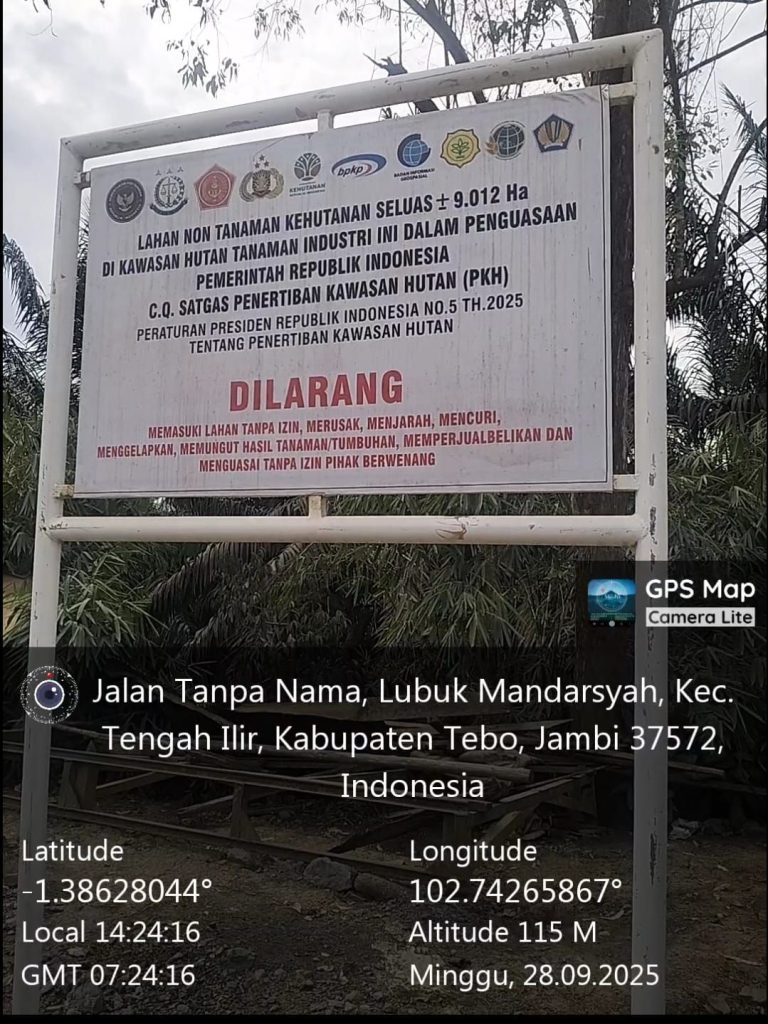 Mediasynergi86.id,LubukMandarsyh- Jambi, 29/09-2025,Kawasan Bukit Tiga puluh sekitarnya jelas ditetapkan oleh Team terkait SATGASUS PKH Harus dihentikan dan disegel segala macam Kegiatan yang beroperasional nyata ditantang tidak diindahkan oleh PT.ADT Dan PT.WKS Dalam hal ini sebagai pihak dikenal mencaplok Kawasan.